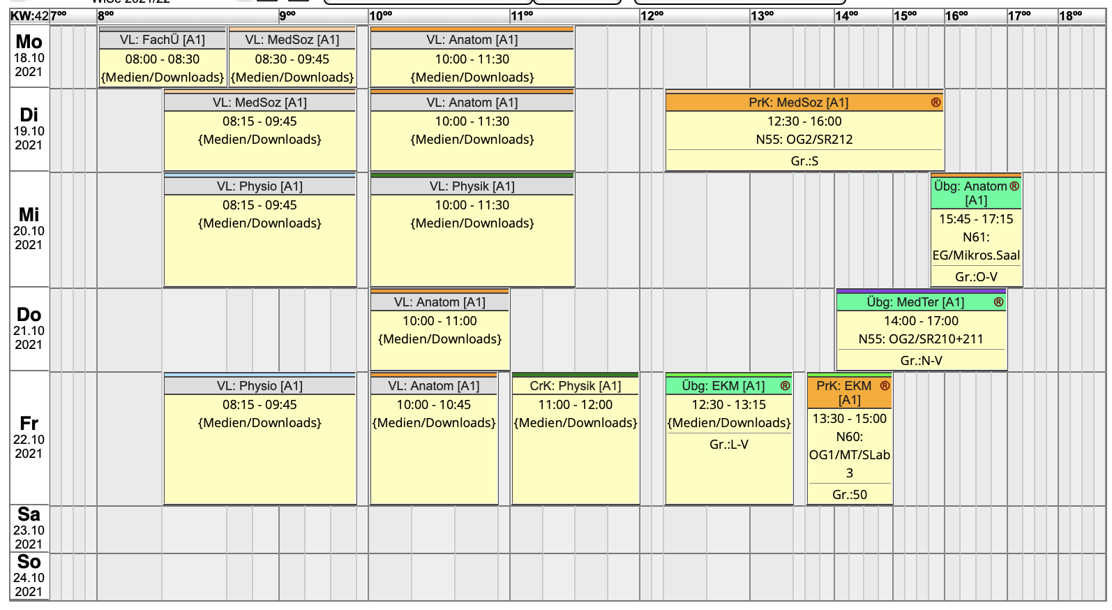 So sah mein Stundenplan in der ersten Woche aus: