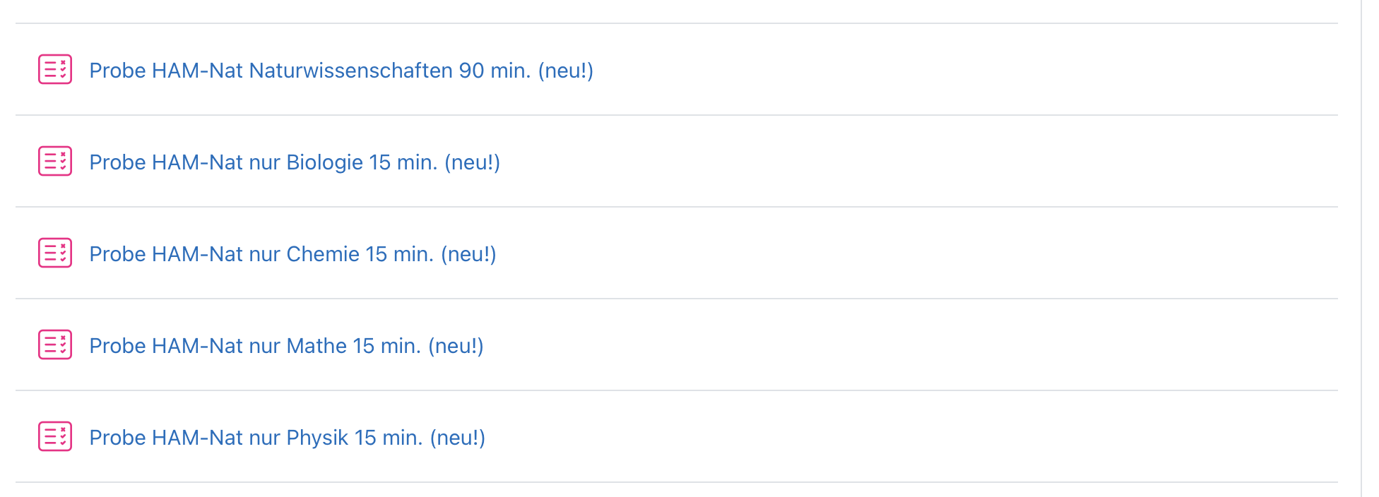 Unter „Probe HAM-Nat“ nur Biologie, Chemie, Mathe oder Physik findest du Originalaufgaben nach Fach sortiert. Das sind Mini-Simulationen mit jeweils 10 Fragen und einem Zeitlimit von 15 Minuten.